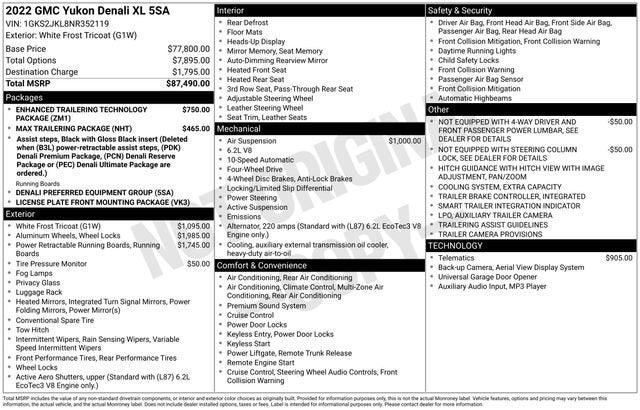 Equipped with a powerful EcoTec3 6.2L V8 engine and a 10-speed automatic transmission, the Yukon XL Denali delivers impressive performance and efficiency. Boasting 4WD capabilities, this SUV is ready to take on any adventure, with features like the Enhanced Trailering Technology Package, Max Trailering Package, and Trailer Tire Pressure Monitor Sensors ensuring a confident and secure towing experience.